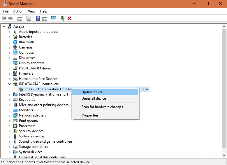 - 也可以按Win + X并选择“ 设备管理器”。展开左窗格中的“ IDE ATA / SATA controller”,右键单击Standard SATA AHCI Controller,然后选择Update Driver。