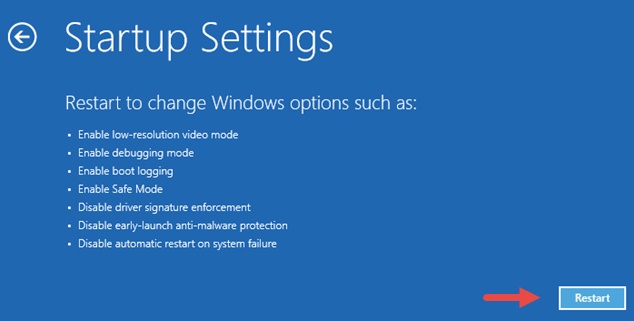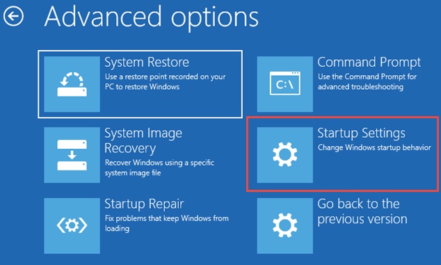 1. 从提供的“高级选项”中,单击“启动设置”。