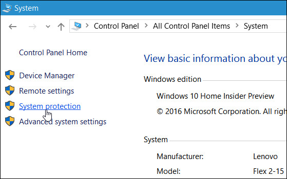 1. 启动控制面板并转到其系统>系统保护功能。