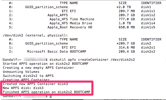 - 假设磁盘的标识符是“disk2s3”。要格式化此磁盘,请提输入命令“diskutil apfs createContainer / dev / <identifier>”。由于磁盘的标识符是disk2s3,因此命令为“diskutil apfs createContainer / dev / disk2s3”。