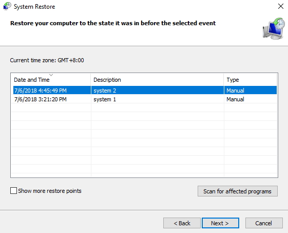 • 单击“ 下一步”,您将看到窗口中列出的所有还原点。您可以选择一个还原点,然后单击下一步。