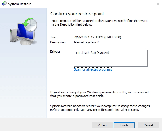 • 在下一个窗口中,您需要确认还原点,然后单击“ 完成”按钮以启动该过程。