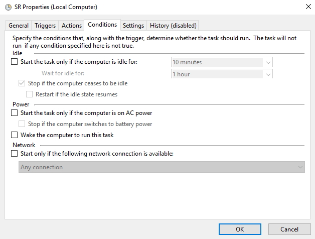 • 之后,您可以单击“ 条件”选项卡以指定这些条件,并取消选中“仅在计算机处于交流电源时启动”,仅在计算机空闲时启动任务。