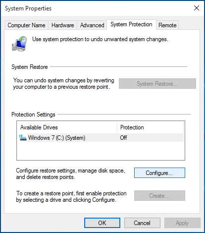 • 选择一个驱动器,然后按Configure以打开系统保护。