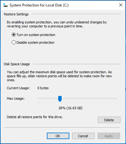 • 如果发生低最大使用量,则无法创建还原点。在继续之前,请确保磁盘中有足够的空间。在“系统保护”中,您可以调整磁盘空间以容纳更多存储点。