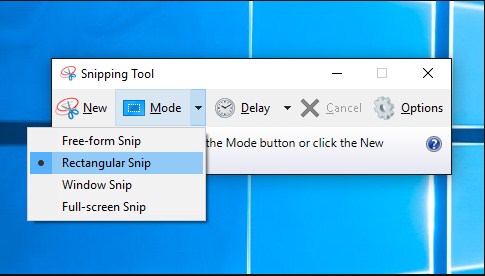 - 工具处于活动状态后,只需选择“模式”,然后在“自由形式”,“矩形”,“窗口”或“全屏”剪辑选项之间进行选择。