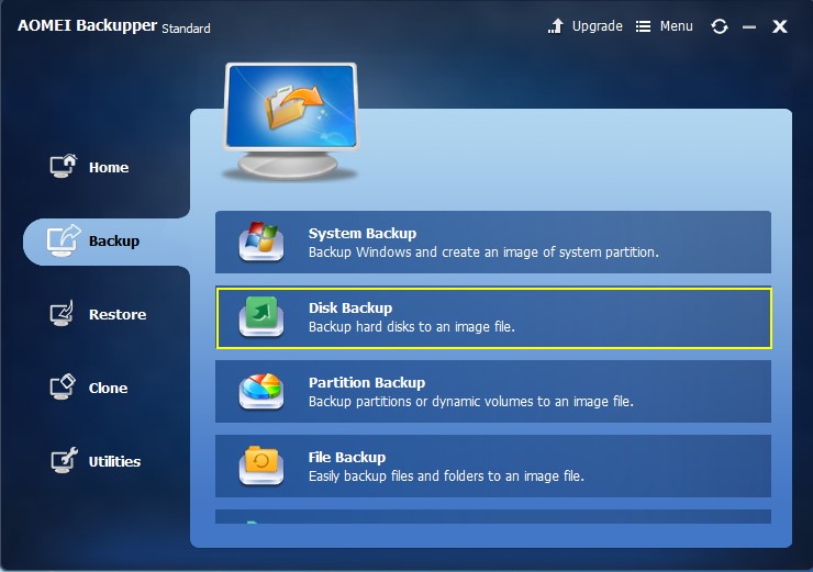 要开始备份过程,请在计算机上下载并安装AOMEI Backupper软件。之后,运行该软件。从软件的主界面中,选择“磁盘备份”选项。