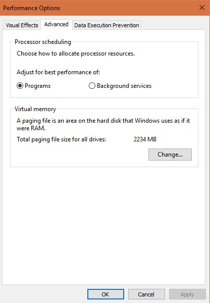 • 选择“ 高级”您将在所有驱动器的“总页面文件大小”中看到“ 更改”按钮,然后选择它。