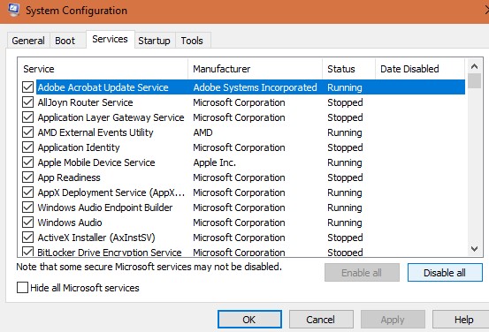 • 单击“ 服务”选项卡,然后选择启动时不需要的服务,并选择“ 全部禁用”。
