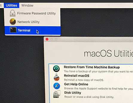 步骤2当出现“OS X Utilities”屏幕时,请下拉屏幕顶部的“Utilities”菜单,然后选择“Terminal”。