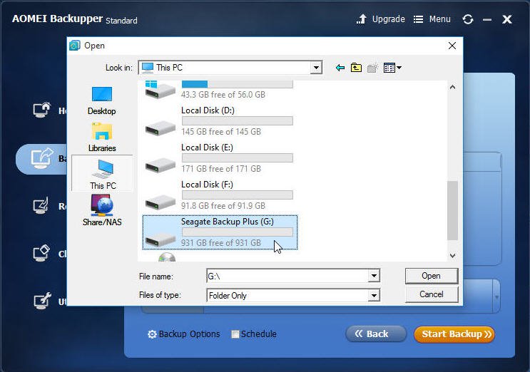 AOMEI允许用户克隆或备份到外部硬盘,本地磁盘,USB闪存驱动器,网络共享,NAS设备,云驱动器等。